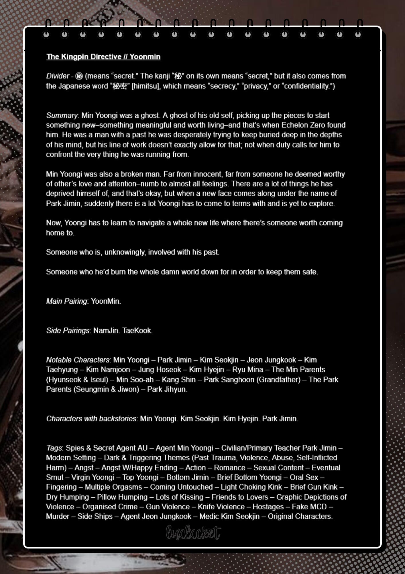 Hello, lovely! My name is Lucy, but everyone just calls me Lux :)I have been writing fanfics since 2018, originally starting with stories for two YouTube Ships; Fitz x TobyontheTele, as well as Ryguyrocky x TinatheTiger. These were done over on Wattpad! By 2020, I was writing oneshots for a Thai BL couple from one of my favourite BL series called 2Moons2, for the ship MingKit/JoongNine.2 Years ago, however, I started writing for Yoonmin, and it has been the most amazing experience and I’m so thankful to have met so many lovely people over on Twitter because of it.